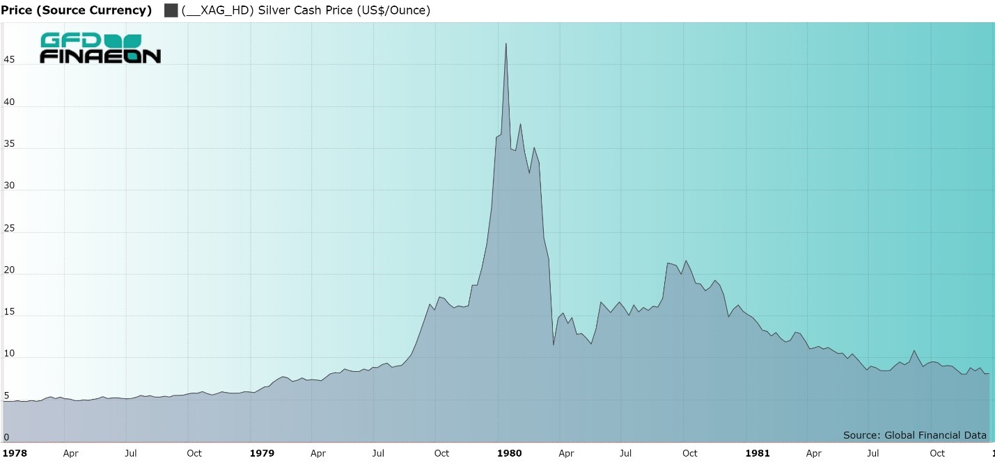 Nelson Bunker Hunt had bought millions of ounces of silver in 1973, but had generally ignored the precious metal for the next few years. In 1978, following his success in the soybean market, Nelson decided to take control of the silver market. Nelson’s idea was to “buy” millions of ounces of silver through the futures markets and corner the amount of certifiable silver that was available, driving up the value of his holdings and making billions in the process. Nelson had seen the price of oil go from $3 to $30 during the 1970s and with inflation raging throughout the world, he saw no reason why silver shouldn’t permanently rise in price as well. Silver had been used as money for thousands of years. Hunt believed paper money was a false creation of the government that would ultimately collapse. If OPEC could create a cartel that drove up the price of oil, why couldn’t Nelson create a cartel to buy up the supply of silver and profit from it? As in the case of soybeans, Nelson got fellow family members involved in the corner as well as several Saudi sheikhs and other speculators who agreed with Nelson’s evaluation of the silver market. On July 1, 1979, the Hunts formed the International Metals Investment Co. (IMIC) with Prince Fahd who ran the Saudi Central bank to buy silver and drive the price up. IMIC bought 43 million ounces which added to the 55 million ounces the Hunts already owned. The attempt to corner the silver market had begun. However, as I have shown in similar blogs on the Piggly Crisis and Stutz Automobile, the problem with executing a corner successfully is that you have to borrow money to drive the price up and you can create a huge profit on paper once you corner the market, but inevitably, you must sell the underlying stock or commodity to someone else, and when this happens, the price of the good will collapse and the accumulated debt will drive most speculators into bankruptcy. This is why selling the underlying commodity after a corner is completed is called “burying the corpse” because it is probably the corpse of the person who cornered the market that will be buried. Throughout the silver fiasco, the Hunts alleged that they were not trying to corner the silver market, but that they were simply trying to hedge against the voracious inflation that engulfed the world in the 1970s. But did the Hunts need to own three-fourths of the world’s privately-owned silver to achieve that? As I detailed in the case of Eddie Gilbert, there is no clear line between speculation and manipulation. Attempts to manipulate the price of a commodity is illegal in the United States and if the weight of the market doesn’t overwhelm the person trying to corner the market, the government and the commodity exchanges will.