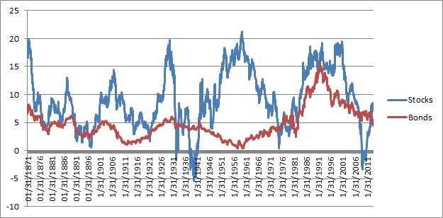 The graph illustrates that stocks generally outperform bonds over time, and that stock returns are more volatile than bond returns. What is more interesting than these well-known facts are the periodic, but rare, occasions when bonds outperform stocks over a ten-year period. The primary periods when stock returns fell below bond returns were in the 1880s and 1890s, the 1930s, the 1970s and the 2000s. Over the past 150 years, these have been once-in-a-generation events that are followed by periods of several decades in which stocks consistently outperform bonds, in some cases by wide margins.