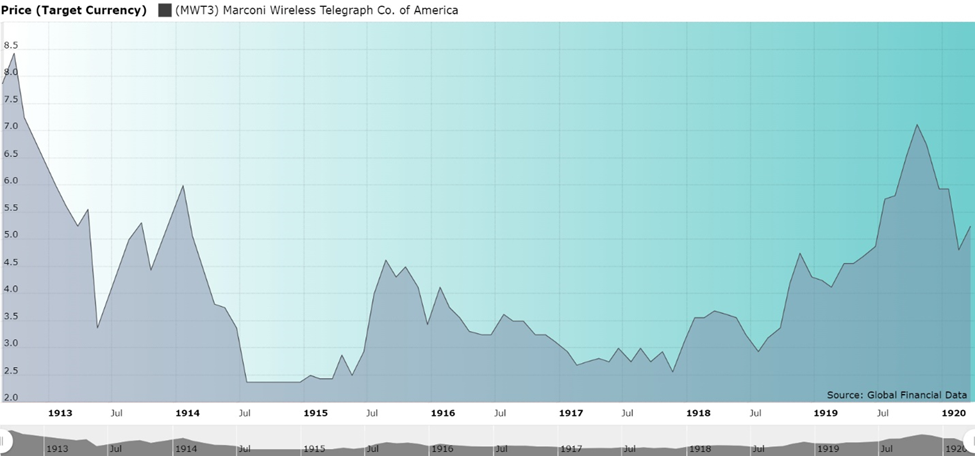 RCA started out as Marconi Wireless. The Wireless Telegraph and Signal Co., Ltd. was founded in London in 1897 to promote the radio inventions of Guglielmo Marconi. American Marconi was established as a subsidiary of Marconi Wireless in 1899, and in 1912 it took over the assets of the bankrupt United Wireless Telegraph Co. and became the dominant radio communications company in the United States. As can be seen in Figure 1, Marconi Wireless Telegraph Co. was treated as a utility and made little progress between 1912 and 1920.