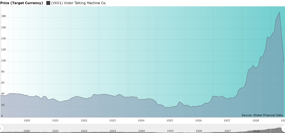 During the skyrocketing increase in price in the 1920s, RCA acquired Victor Talking Machines stock. “Free” radio reduced demand for phonographs, and the Victor Talking Machine Co. was the largest producer of phonographs in the United States. RCA bought Victor for its production and distribution facilities, planning to use its factory in Camden, New Jersey to produce radios that it could sell through the company’s authorized distributors and dealers. As Figure 3 shows, Victor stock rose from 32 in July 1927 to 190 in April 1929. Both RCA and Victor Talking Machines were added to the Dow Jones Industrial Average on October 1, 1928. RCA introduced all-electric Victrolas and 33 1/3 rpm records in 1930, though these were initially a failure, and 45 rpm records in 1949. Victor and the dog listening to phonographs became an important part of RCA.