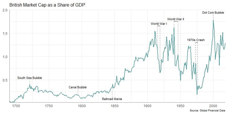 Global Financial Data has produced indices that cover global markets from 1601 until 2018. In organizing this data, we have discovered that the history of the stock market over the past 400 years can be broken up into four distinct eras when economic and political factors affected the size and organization of the stock market in different ways. Politics and economics define the limits of financial markets by determining whether companies can exist in the private or the public sector, by controlling the flow of capital in financial markets, and by determining the level of regulation that companies face in maximizing their profits. The first era covers the period from 1600 until 1815 when financial markets funded government bonds and a handful of government monopolies. The British East India Company was established in 1600. For the next 200 years, financial markets traded a very limited number of securities. After the bubbles of 1719-1720, shares traded more like bonds than equities. Investors were more interested in getting a secure return on their money than investing for capital gains. The second period from 1815 until 1914 was one of expanding equity markets, globalization of financial markets, and a reduction in the importance of government bonds relative to equities. This changed in the 1790s when first canals, and later railroads changed the nature of financial markets forever. Investors discovered that transportation stocks could provide reliable dividends as well as capital gains. For the next hundred years, investors had the opportunity to invest in thousands of companies that could generate capital gains as well as dividends. Financial markets became globalized and the transportation revolution enabled the global economy to grow. By 1914, capital flowed freely throughout Europe and the rest of the world, enabling investors to optimize returns globally. The era of globalized financial markets came to an end on July 31, 1914 when the world’s stock markets closed down when World War I began. During the war, capital was directed toward paying for the war. Attempts to restore globalized financial markets after the war failed. Financial markets operated on a national level, not on an international level. Before World War I, markets provided similar returns because they were integrated. After the war, national equity market returns diverged because capital was unable to flow to the countries with the highest rates of return. After World War II, Europe nationalized many of its main industries and the United States regulated industries. It wasn’t until the 1980s that equity markets became globalized once again when deregulation and privatization swept over the world’s stock markets. The poor performance of markets and the economy in response to the OPEC Oil Crisis of the 1970s brought the role of government in regulating the economy into question. Privatization swept over the capitalist economies, and the former Communist countries opened stock markets and began to integrate with the world’s financial markets. The global market capitalization/GDP ratio increased dramatically. There is no definitive date when this transition occurred, so the bottom of the bear market in bond and equities in 1981 is used as the starting point of this new era.