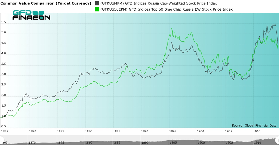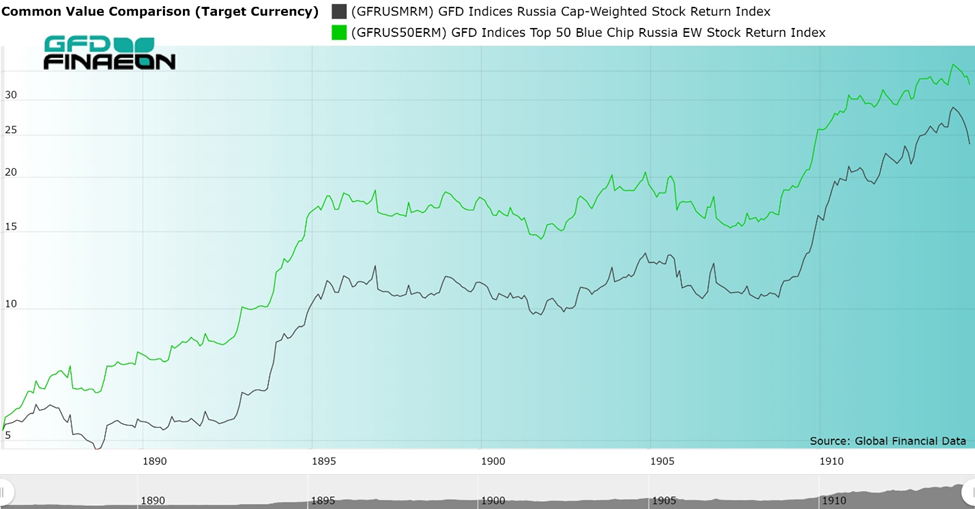 If you study the different sectors, you’ll see that the Bank Index (Black line) never recovered to the 1895 peak, even by 1914. The Railroad (green line) and energy sectors (blue line), however, moved up significantly. Between 1865 and 1905, Russian Railroads made no progress, but between 1905 and 1912, the railroads more than tripled in price. The best performance came from the oil and gas industry which made significant gains in the 1890s and the 1910s. Since the cap-weighted index included more railroad and energy shares than the St. Petersburg stock market in general, this provides the best explanation for the outperformance of the cap-weighted indices over the equal-weighted indices.