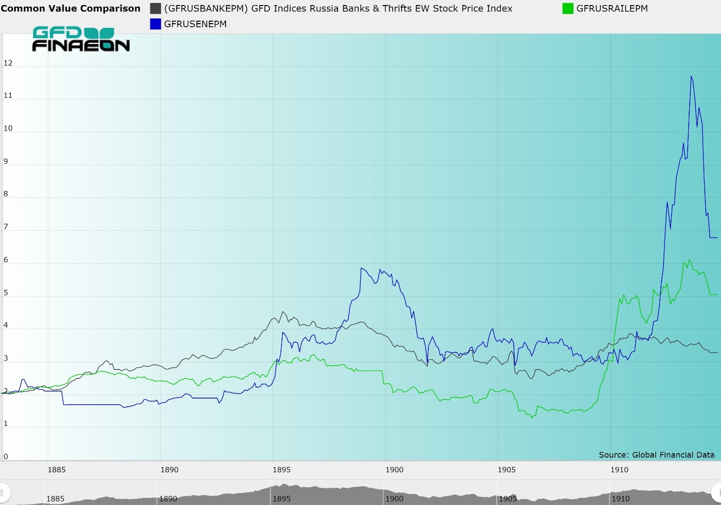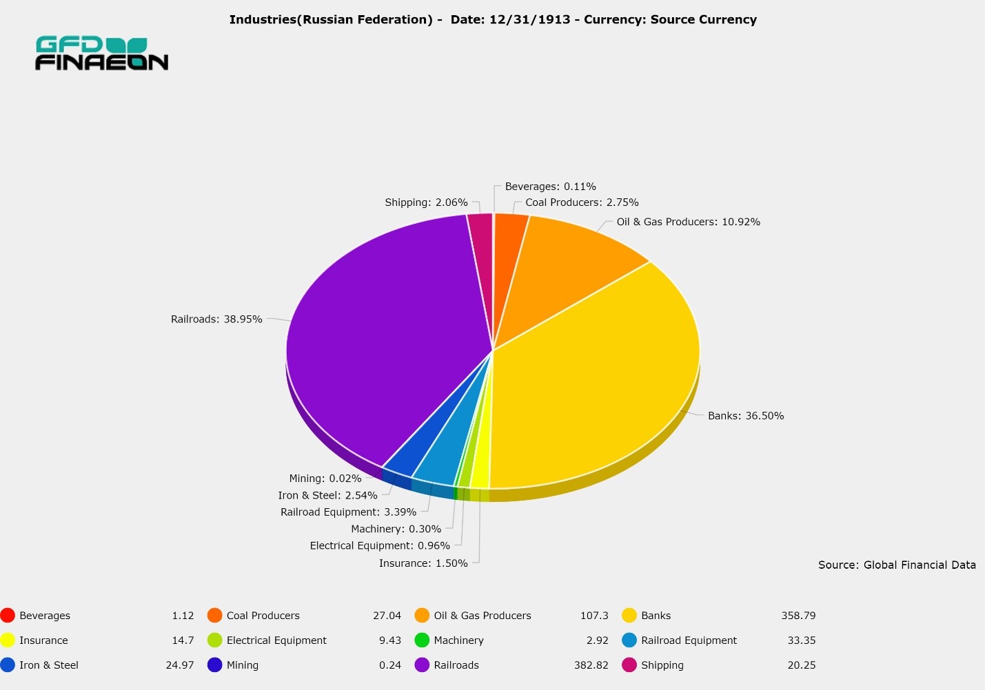Global Financial Data has put together indices of the St. Petersburg Stock Exchange before World War I and the collapse of Russia into Communism. The data was made available to us from Yale’s International Center for Finance. The files were marked in transliterated Cyrillic, so we converted the names back into Cyrillic and then translated the names of the companies into English. We then classified the stocks according to their sector so we could see how one sector did relative to the others. Although the data from Yale was rich in price data, it was lacking in shares outstanding and dividends. The source material that Yale collected only had information on capitalization in the first issue. None of the other issues provided any information on either capitalization or shares outstanding. Except for a few issues around 1900, no data on dividends was available either, and having dividend data for four or five years was hardly sufficient to create a useful total return series.