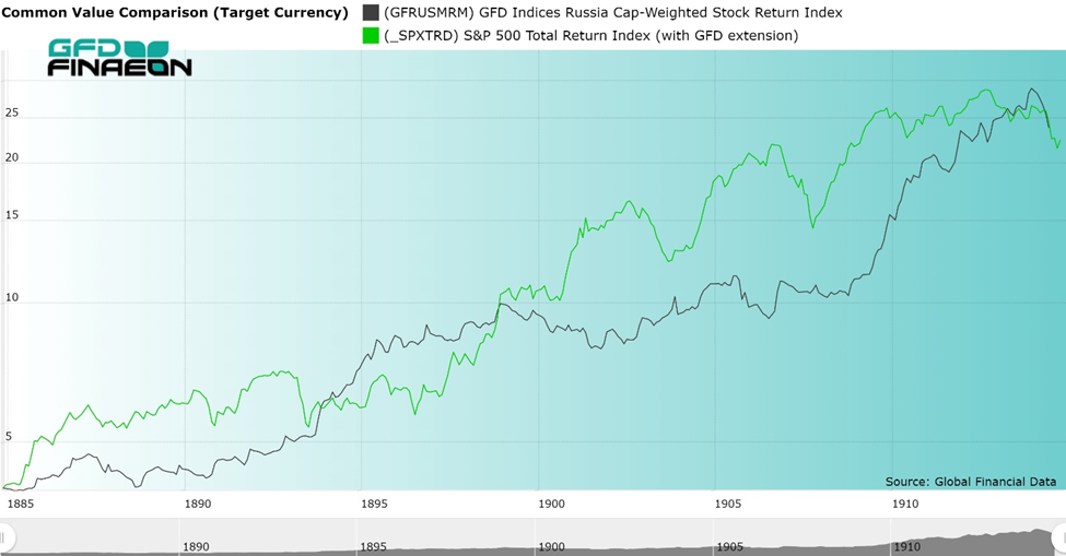 Finally, a comparison was made between the total return to shareholders in the United States and in Russia between 1870 and 1914. Previous comparisons showed that the Russian index had outperformed the American index, but this only compared the prices of the stocks and excluded the dividends that were paid. Russian stocks advanced more in price than American stocks between 1864 and 1914, but American companies paid larger dividends. Price and dividends offset each other and during that 45-year period, the two stock markets provided approximately equal returns. The American and Russian stock markets are compared below.