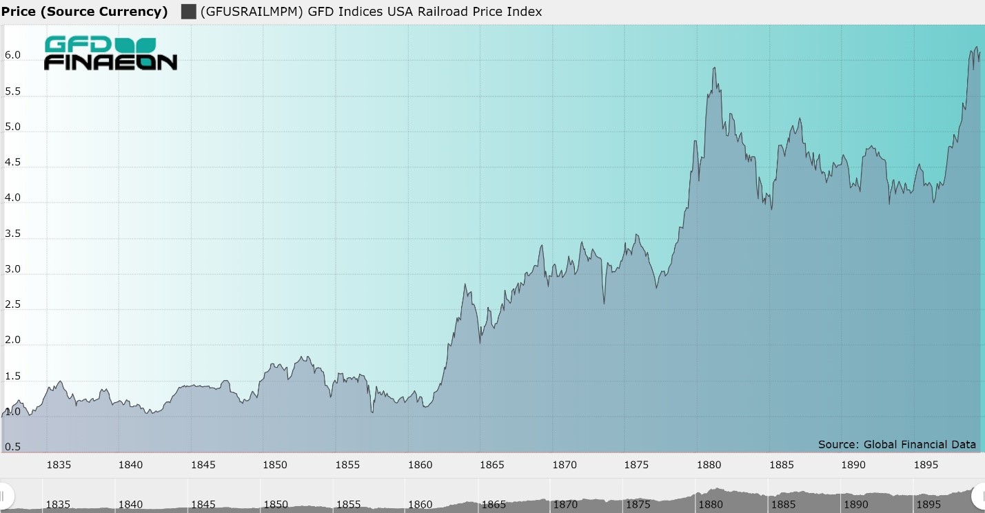 Global Financial Data has made major revisions to three of its popular indices, the Dow Jones Transport Average, the S&P 500 Composite and the S&P 500 Composite Total Return Index. Global Financial Data has recently calculated its own GFD Index for Railroad stocks in the 1800s. Using data GFD has collected on the price of shares, dividends paid on shares and the number of shares outstanding, GFD has calculated a cap-weighted index of the price and total return to railroad shares from 1832 until 2018. In each year, Global Financial Data chose the top 40 companies by capitalization, then narrowed the list down to the top 25 companies by liquidity and used those 25 companies to calculate GFD’s Railroad Index. The index is illustrated below.